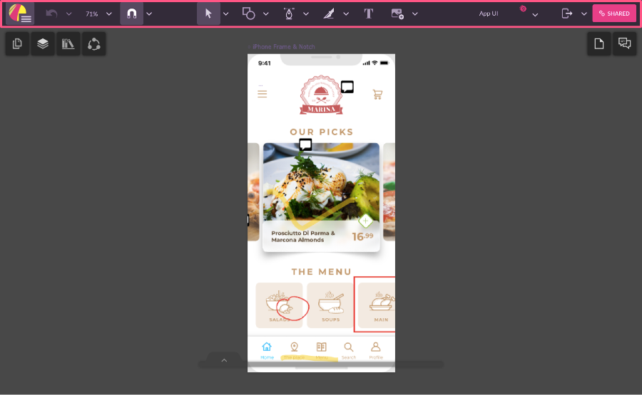 The toolbar is located at the top of the Gravit Designer window. It contains Gravit Designer tools, as well as some frequently used commands. See more on tools here.