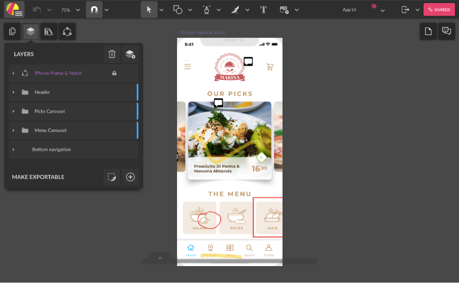 The Gravit Designer interface has five main parts: toolbar, canvas, Inspector panel, Layers panel, and menu bar. We are working hard to keep the interface as simple as possible, but allow the power users to work fast and efficiently while accessing many advanced features.