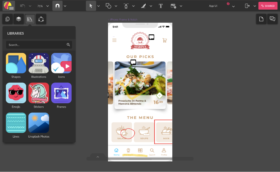 The Libraries tab is searchable collection of design assets that you can use in your design. Libraries include Shapes, Illustrations, Icons, Emojis, Stickers, Frames, and Lines. You can the search bar to find assets and then drag them directly on the canvas.