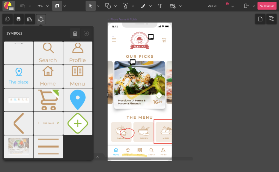 The Symbols tab lists all symbols used in the current document. You can drag a symbol thumbnail to the canvas. Learn more about symbols
