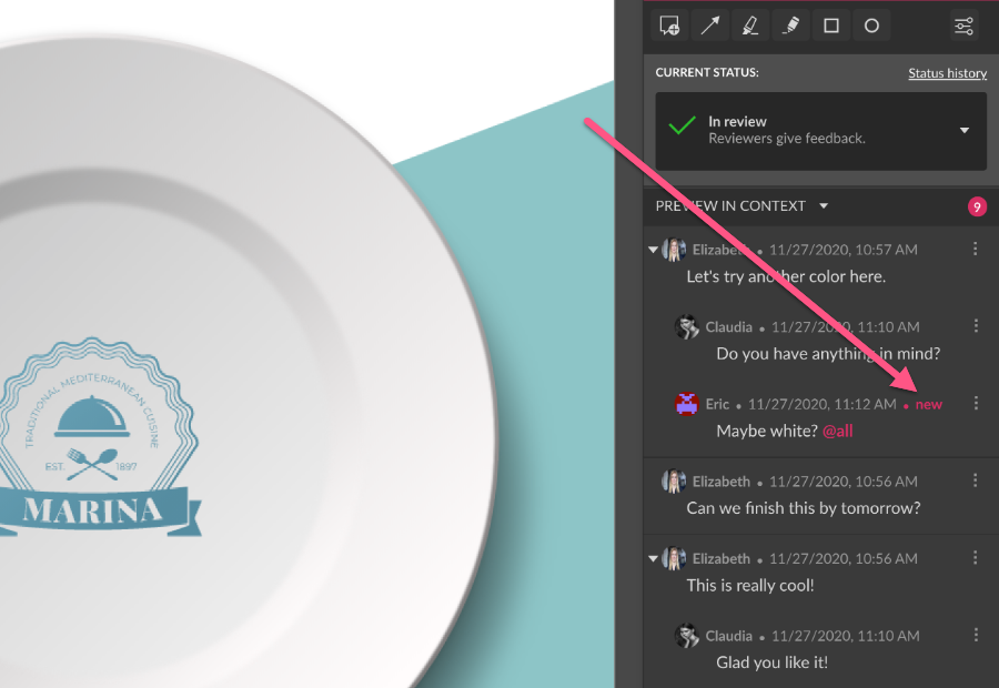 The Comments tab is where users with access to shared files can interact by leaving comments, annotations and answering questions from other users. The annotation tools are located at the top, along with the status of the review process. Comments are divided by document page.