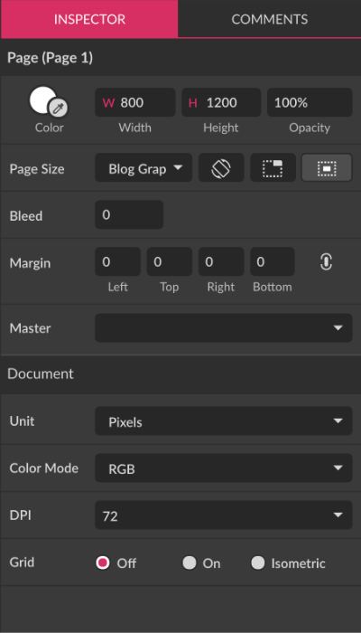 If nothing is selected, the Inspector panel displays the current page (canvas) properties, as well as some document properties.