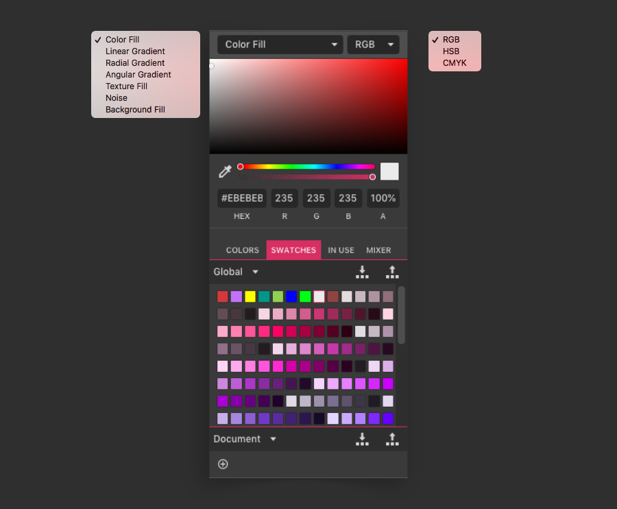 Gravit Designer supports three color spaces – RGB, HSB, and CMYK.