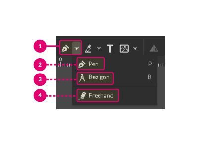 Tools used to create a path in Gravit Designer are located under the Pen Tool drop-down in the Tools Panel.