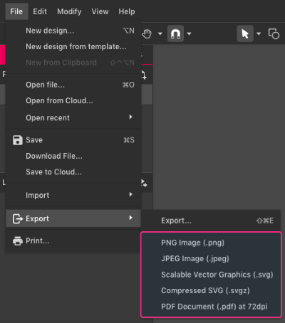 You can share your creations in Gravit Designer by exporting layers, groups, objects, or slices of your design to different file formats and sizes. File formats supported for exporting include SVG (.svg), PDF (.pdf), PNG (.png) and JPEG (.jpeg).