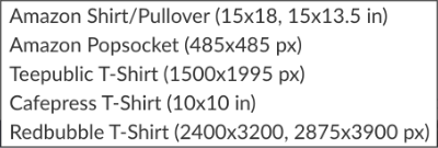 - Print on Demand is a list of sizes for designers promoting and selling their designs on popular online platforms, such as Amazon Merch, Redbubble, Teepublic, and Cafepress.