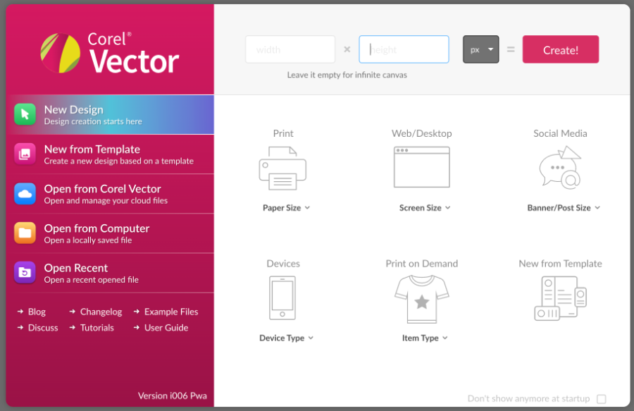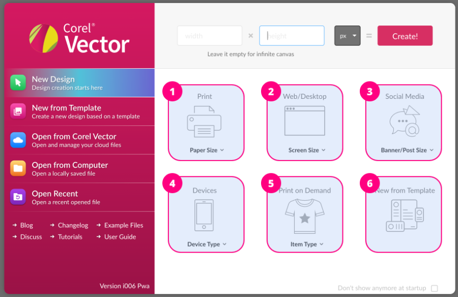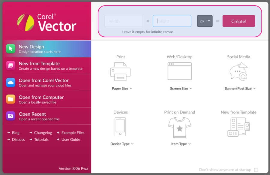 The most popular print and screen sizes are accessible right from the Welcome screen. You can easily start a project without using any other template, or you can set the design size yourself.