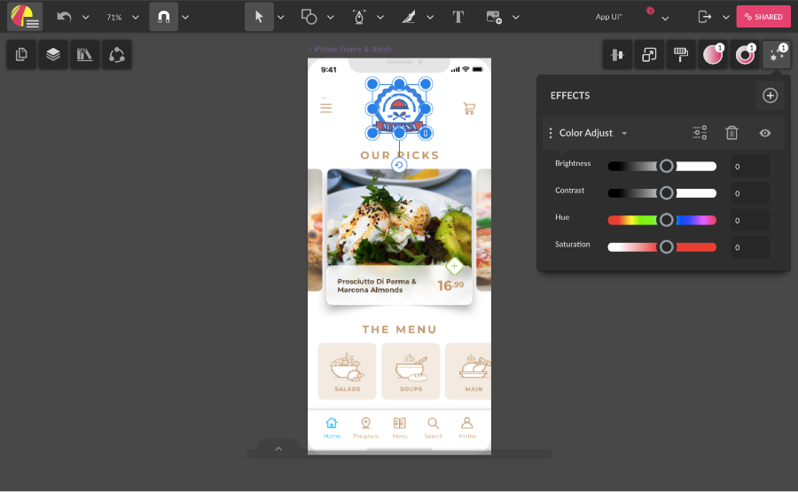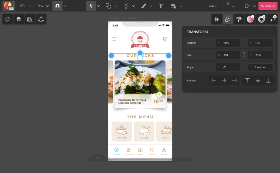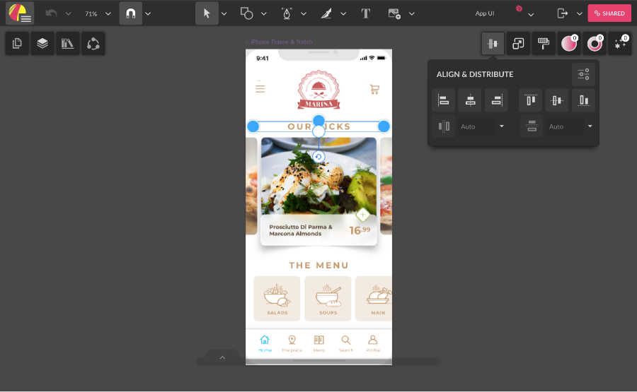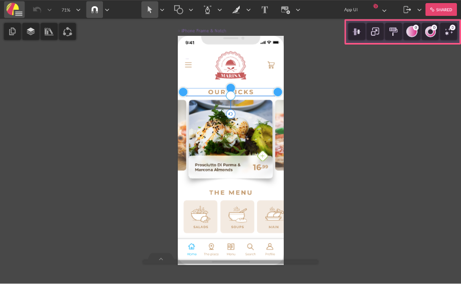 With an element selected on the canvas, the rest of the panels are displayed on the right.