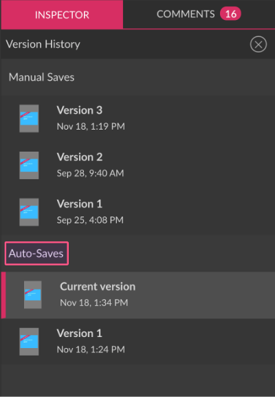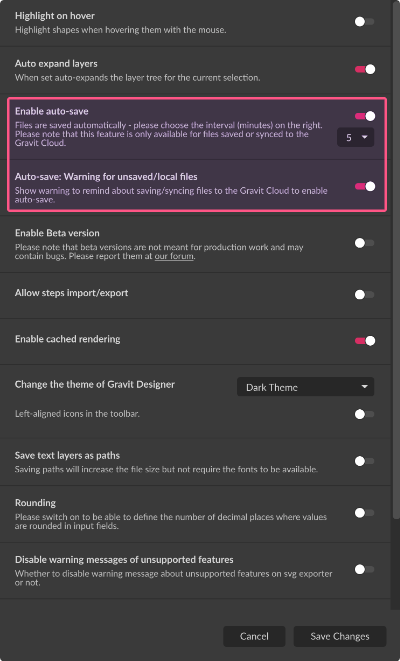 Gravit Designer automatically saves your progress every 5 minutes for files stored or synched to the cloud. Every auto-save creates a new entry in the file’s Version History list, in addition to iterations created by manual saving.
