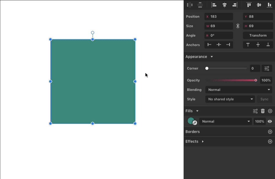 Rectangles have hidden properties, which can be modified with Subselect tool . You can control corners by selecting the rectangle and pressing to activate edit mode, You can modify the corner radius by selecting a red control point and drag it toward the center of the rectangle to round all corners. Alternatively, you can change the radius of the corners in the Appearance section of the Inspector panel by moving Corner slider or by typing a value in the box next to the slider.