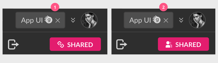 It’s indicated that a file is shared when you open it through the Share Dialog button itself. The icon differs whether it’s shared publicly only with a chain icon(1) or shared privately with the “people” icon(2).