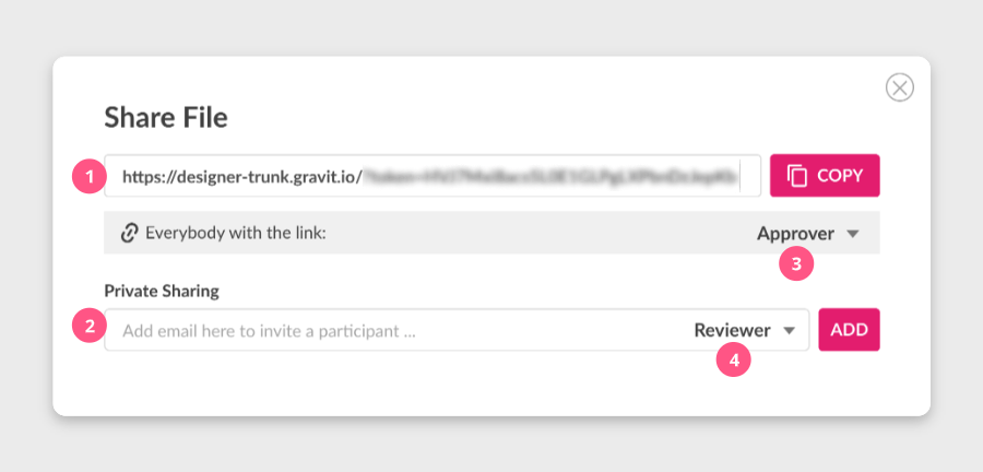 The Share dialog box offers two sharing options, public(1) or private sharing(2), each with its own drop-down to define the collaborator’s roles(3 and 4).