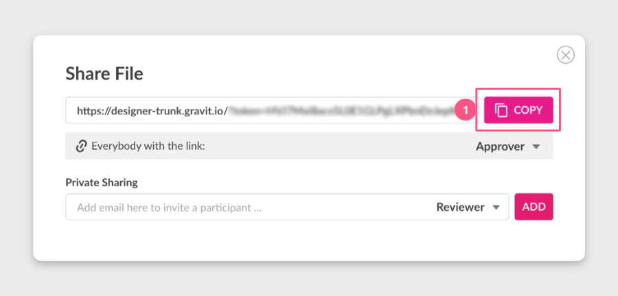 On the Share Dialog, add the email of the guest you want to invite on the Private Sharing input field(1), choose a role, and click Add(2).