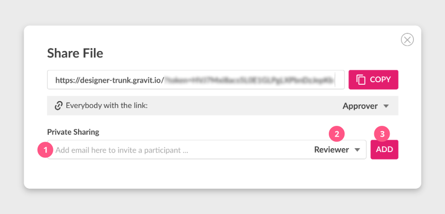 The second option of the Share dialog box allows you to create private sharing links that will be sent via email by adding the email of the user(1), attributing a role(2), and clicking Add(3).