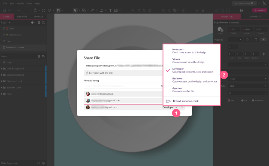 Each collaborator with a Private Sharing link can have a different role, and you can change these roles at any time on the dropdown(1) right next to the listed user’s email, opening a list with the collaboration roles(2). In the same dropdown, it’s possible to resend the email invitation, and also remove that user’s access to the file.