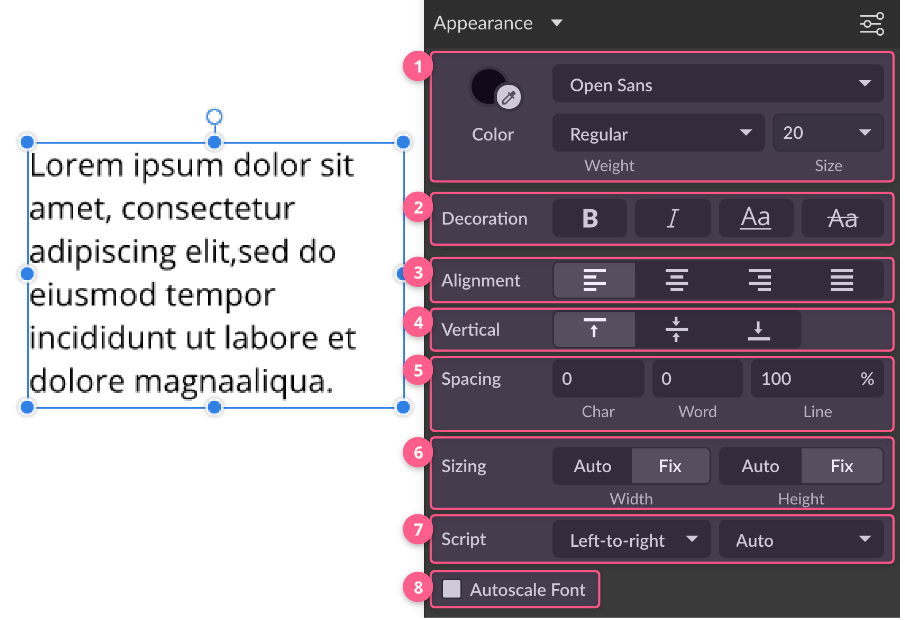 When the Autoscale Font check box in the text properties panel is checked, text is resized like any other vector object. Note: Autoscale Font was called Scale Font on resizing in older versions of Gravit Designer.