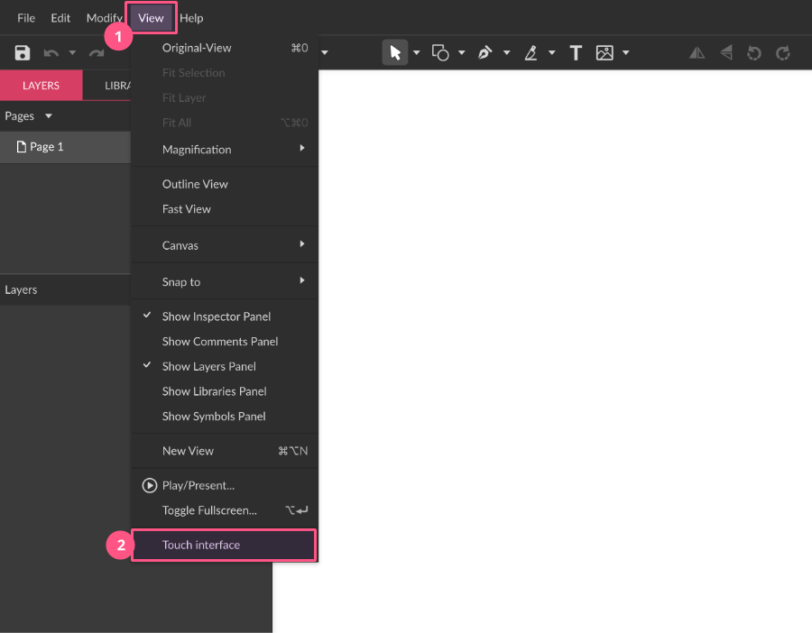 If you’re using a laptop with a touchscreen and want to change to Gravit Designer’s Touch UI, simply go to menu View(1) > Touch Interface(2).