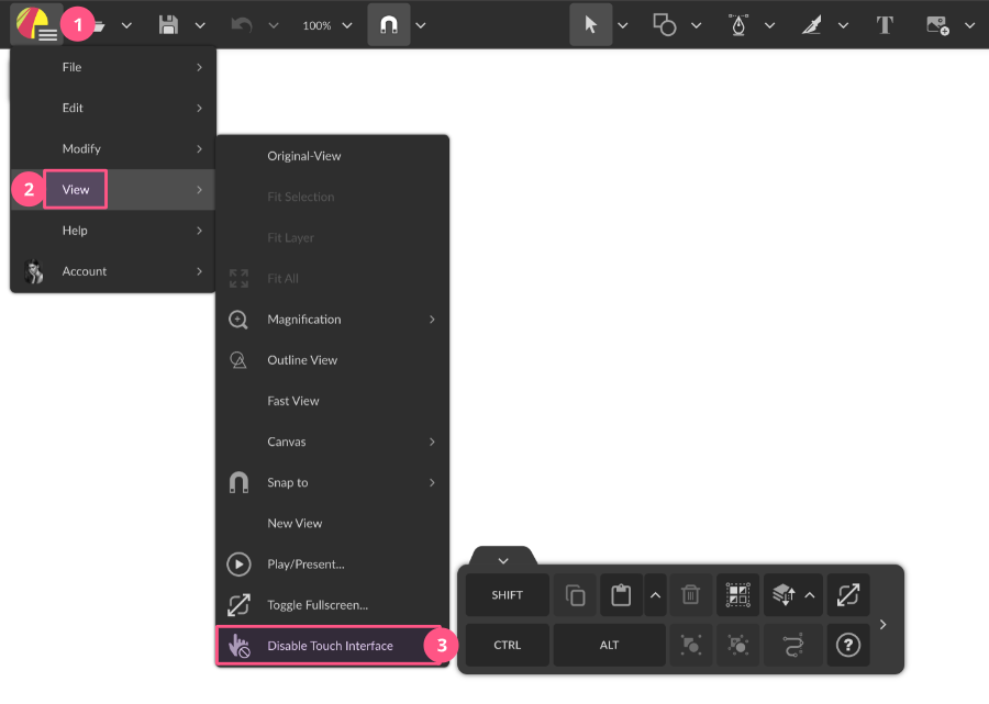To disable it, go to the menu View(2) again (now located on the hamburger menu(1) at the top-left) and choose Disable Touch Interface(3).