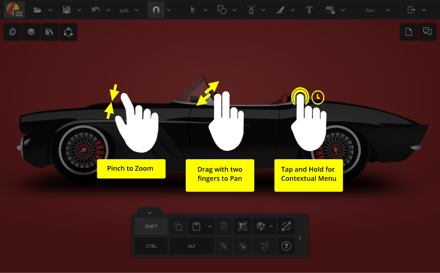 The gestures are standard for using most touch devices – pinch to zoom in or out, drag with two fingers to pan around the canvas, and tap-and-hold (also known as long-press) for contextual menus.