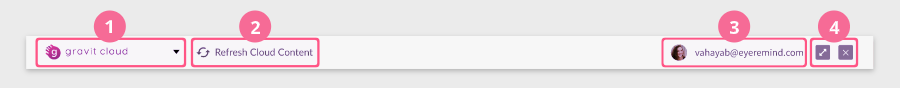 The header contains the Gravit Designer Cloud’s drop down (1), Refresh Cloud Content button (2), your account information (3), and close, maximize/minimize icons (4).